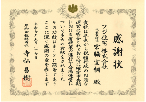 地域活動の一環として、本社ビル、東岸和田ビル及びおうち館各店舗の前面道路を含む周辺道路一帯を、当社スタッフが道路清掃をしております。その結果、東岸和田ビルの前面歩道が「アドプト・ロード・土生町2丁目」と大阪府から認定された他、当社の道路美化に関する取り組みや地域の清掃活動への貢献が認められ、平成20年8月に大阪府道路協会より「道路功労賞」、平成21年10月に泉佐野市の「環境美化善行者表彰」、平成23年8月に国土交通省より『平成23年度「道路ふれあい月間」における道路愛護団体等の国土交通大臣表彰』を受賞いたしました。今後も、地域に愛されるきれいな道路づくりや地域の環境美化に取り組んでまいります。